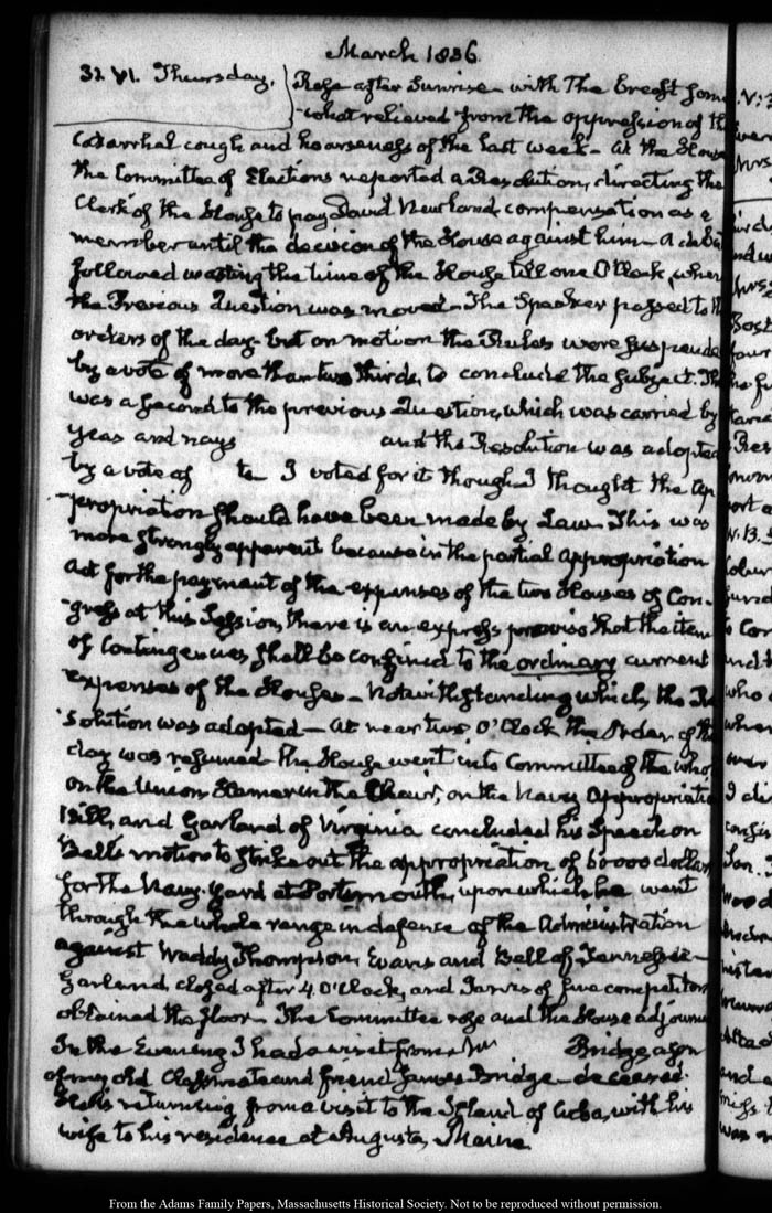 View full, authoritative transcriptions with page images of the diaries at John Quincy Adams Digital Diary part of the Primary Source Cooperative at the MHS.