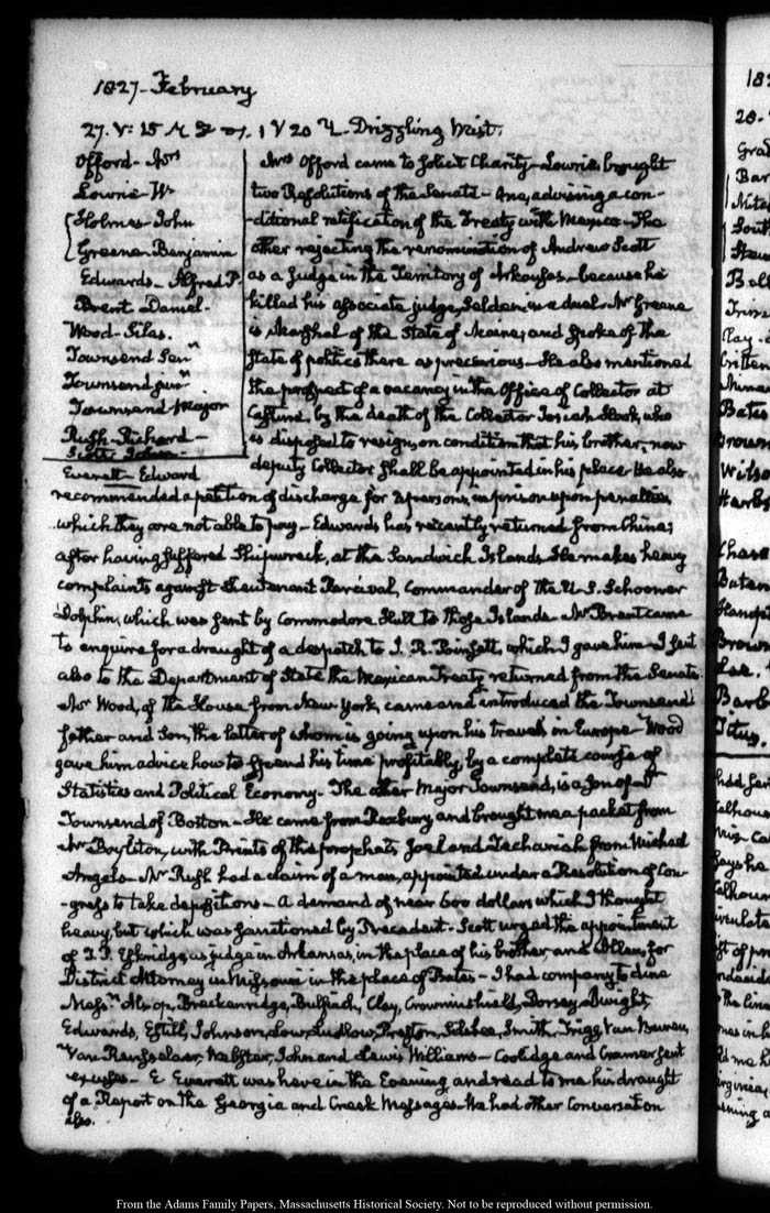 View full, authoritative transcriptions with page images of the diaries at John Quincy Adams Digital Diary part of the Primary Source Cooperative at the MHS.
