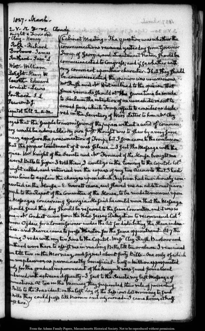 View full, authoritative transcriptions with page images of the diaries at John Quincy Adams Digital Diary part of the Primary Source Cooperative at the MHS.