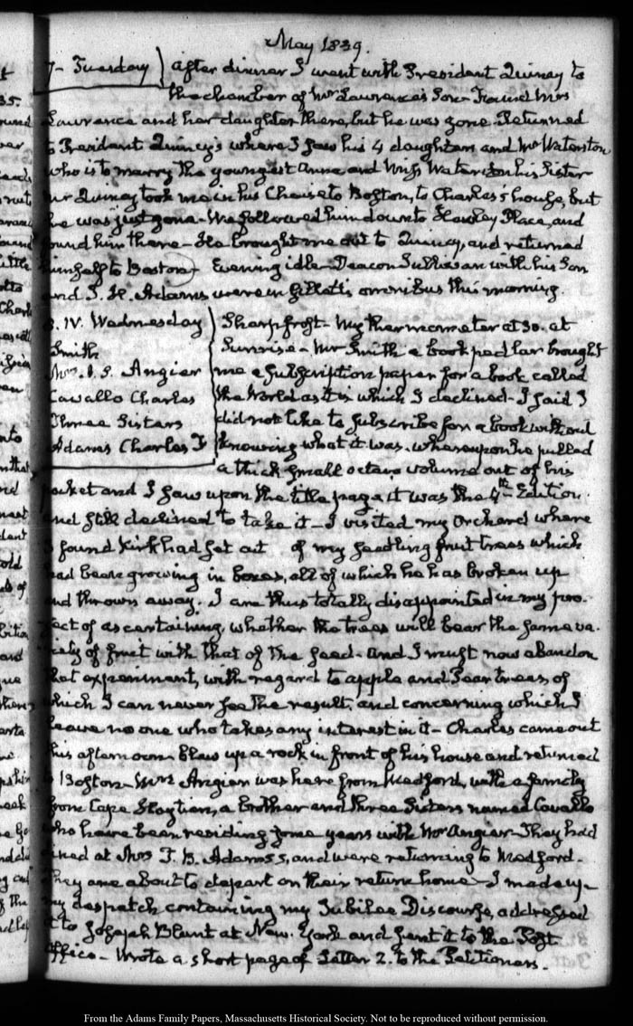 View full, authoritative transcriptions with page images of the diaries at John Quincy Adams Digital Diary part of the Primary Source Cooperative at the MHS.