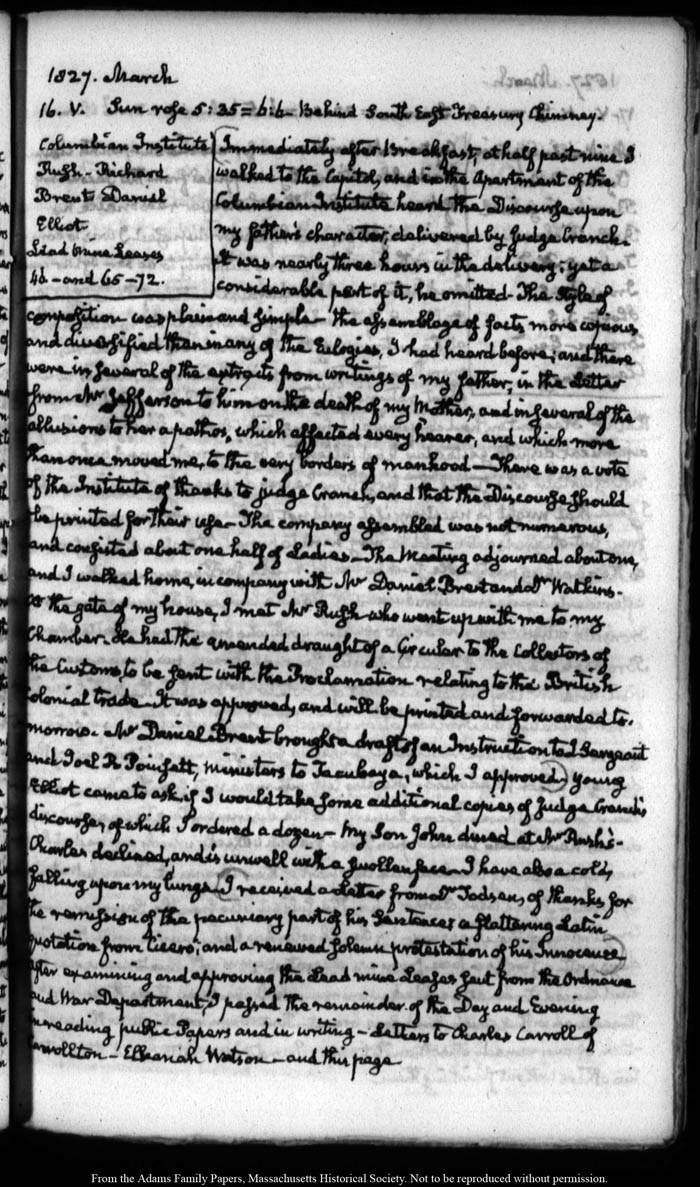 View full, authoritative transcriptions with page images of the diaries at John Quincy Adams Digital Diary part of the Primary Source Cooperative at the MHS.
