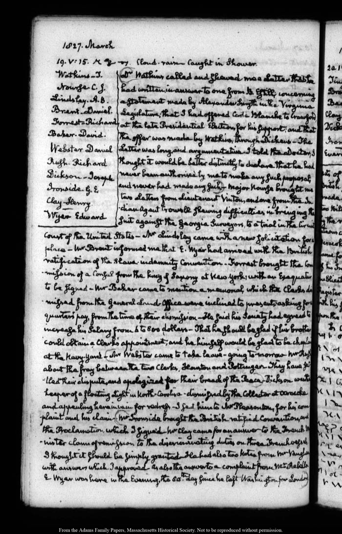 View full, authoritative transcriptions with page images of the diaries at John Quincy Adams Digital Diary part of the Primary Source Cooperative at the MHS.