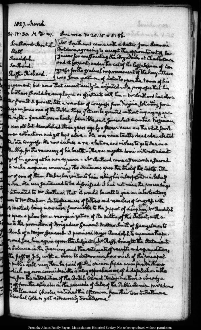 View full, authoritative transcriptions with page images of the diaries at John Quincy Adams Digital Diary part of the Primary Source Cooperative at the MHS.