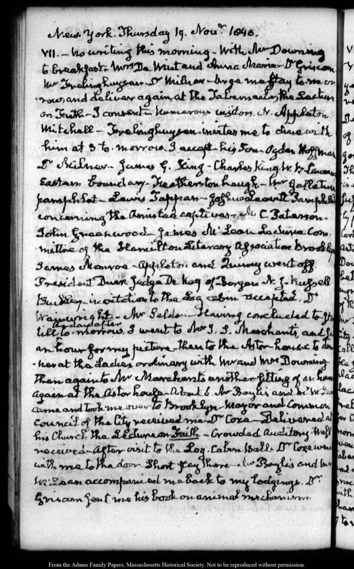 View full, authoritative transcriptions with page images of the diaries at John Quincy Adams Digital Diary part of the Primary Source Cooperative at the MHS.