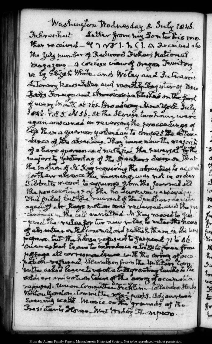 View full, authoritative transcriptions with page images of the diaries at John Quincy Adams Digital Diary part of the Primary Source Cooperative at the MHS.