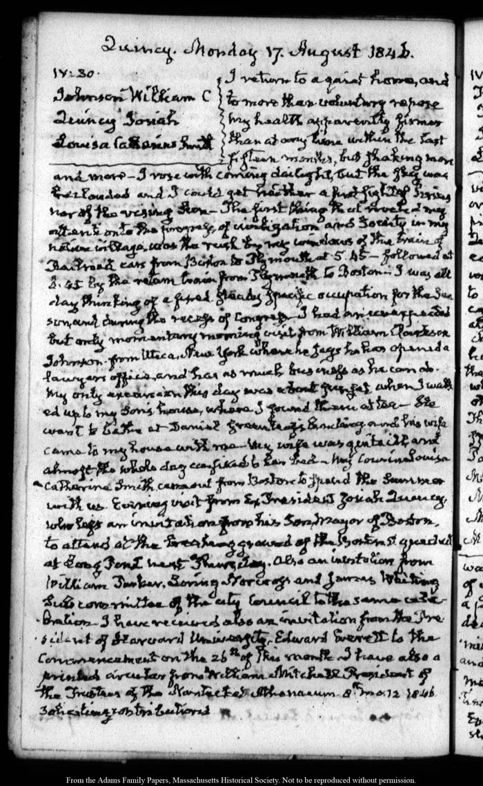 View full, authoritative transcriptions with page images of the diaries at John Quincy Adams Digital Diary part of the Primary Source Cooperative at the MHS.