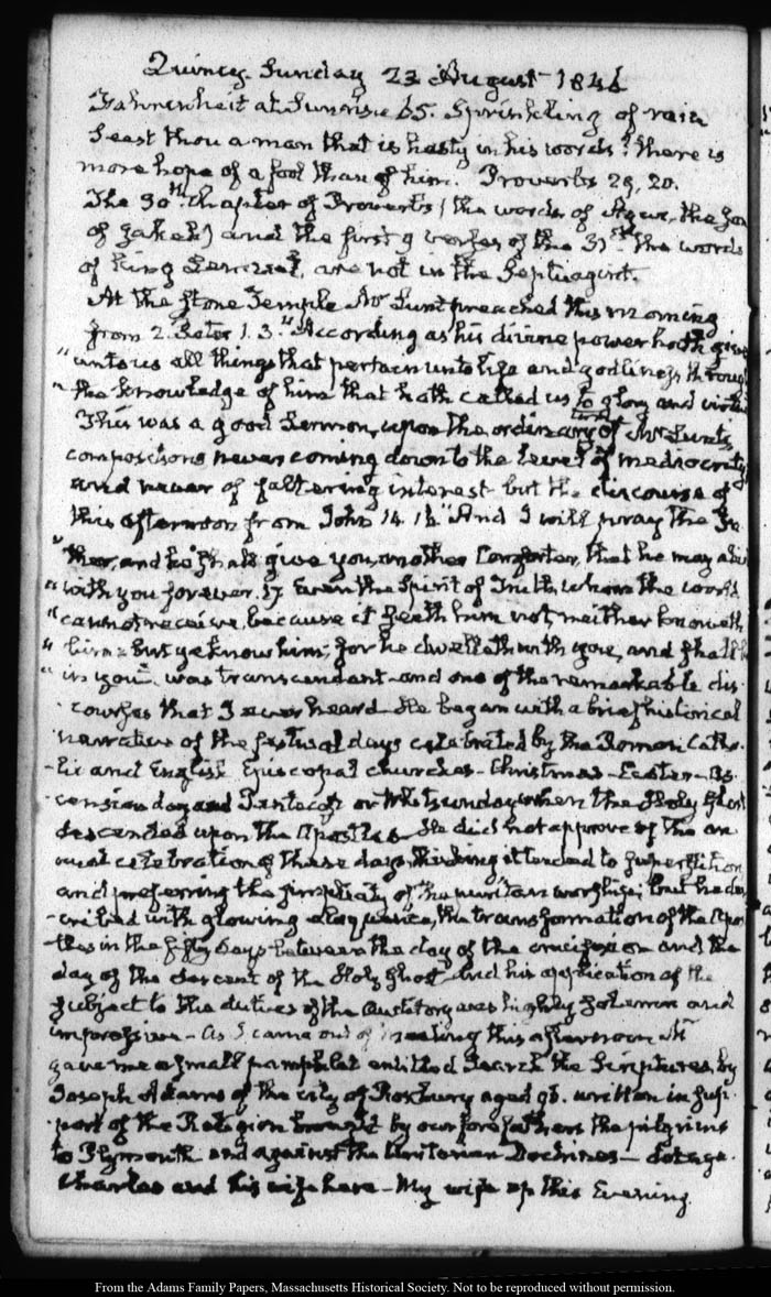 View full, authoritative transcriptions with page images of the diaries at John Quincy Adams Digital Diary part of the Primary Source Cooperative at the MHS.