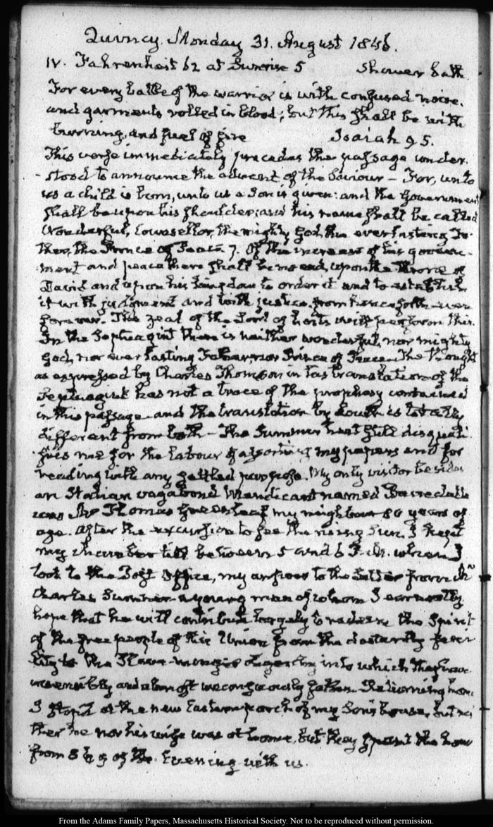 View full, authoritative transcriptions with page images of the diaries at John Quincy Adams Digital Diary part of the Primary Source Cooperative at the MHS.