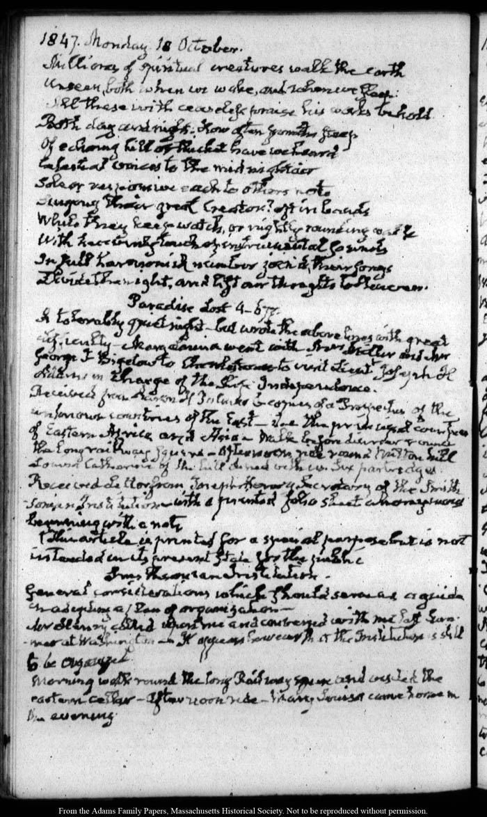 View full, authoritative transcriptions with page images of the diaries at John Quincy Adams Digital Diary part of the Primary Source Cooperative at the MHS.