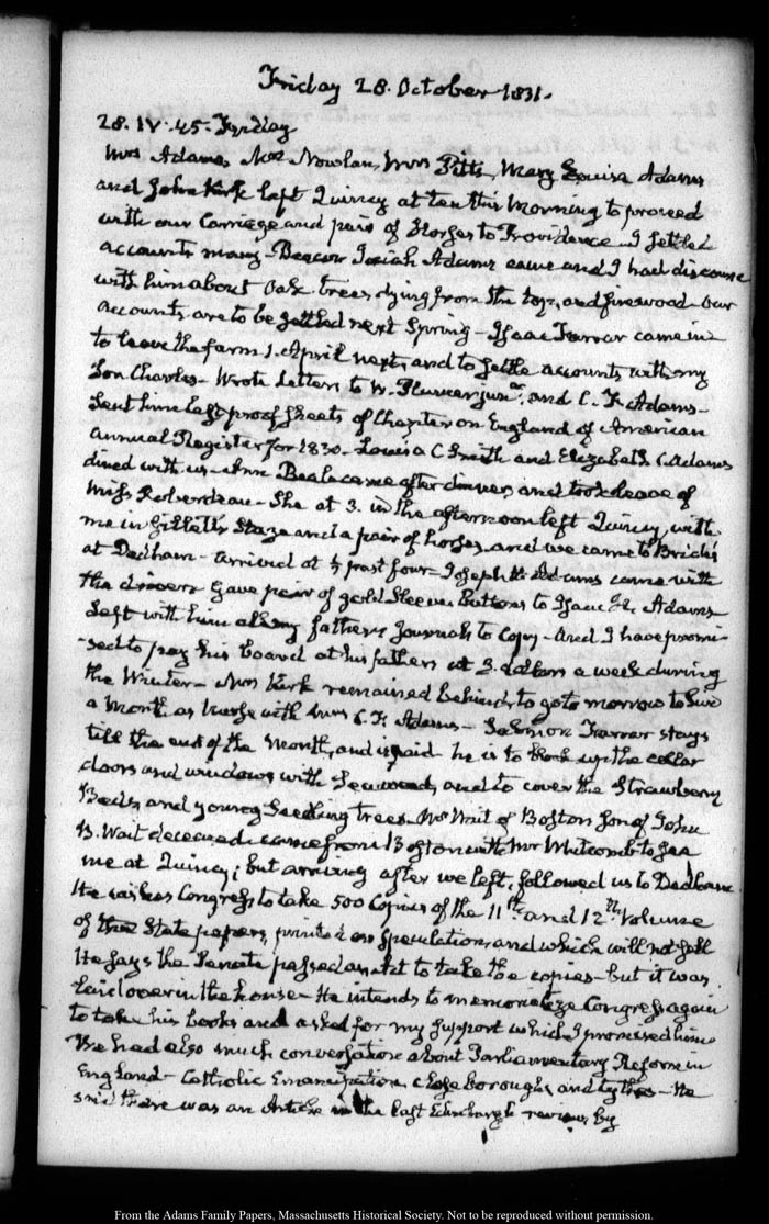 View full, authoritative transcriptions with page images of the diaries at John Quincy Adams Digital Diary part of the Primary Source Cooperative at the MHS.