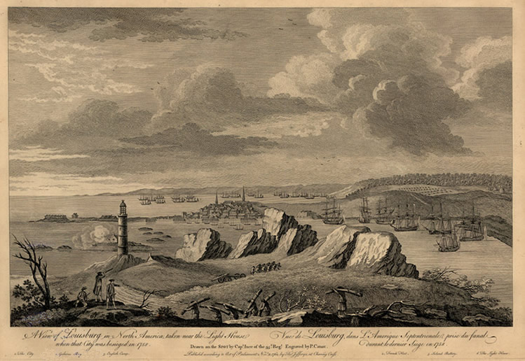| On June 12, 1758, Brig. James Wolfe seized Light House Point on the northern shore opposite Louisbourg. This scene depicts the ships in the harbor (right) and Wolfes soldiers bringing up fusilade, which opened fire on the fortress on June 19. A puff of smoke to the left of the lighthouse marks a French position on Battery Island. Wolfes guns effectively silenced this battery and forced the French to withdraw. The ships in the distance beyond the lighthouse are the British fleet anchored in Gabarus Bay. |