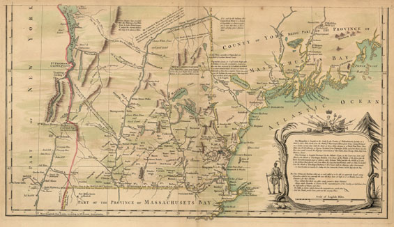This section from "An Accurate Map of His Majesty's Province of New Hampshire..." provides a close-up of the territory that stood at the crossroads of northern New England. Bounded on east and south by Massachusetts (Maine was part of Massachusetts), to the west by New York, and on the north by Canada, the colony was often caught in disputes between its more powerful neighbors. New Hampshire and New York competed over the territory between the Connecticut and Hudson Rivers, which is now Vermont. The written descriptions of the colony's boundary are somewhat vague, measured in one instance at “three Miles distance from a Pitch Pine Tree.” The fanciful track of the Connecticut River as it arches east at its northern end also indicates the lack of a good survey.