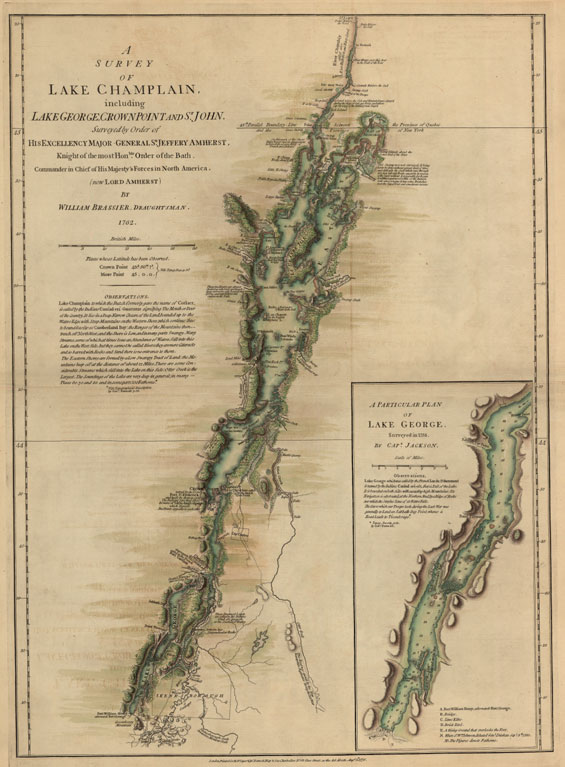 “A Survey of Lake Champlain including Lake George, Crown Point, and St. John. Surveyed by Order of His Excellency Major-General Sr. Jeffery Amherst, Knight of the most Honble. Order of the Bath. Commander in Chief of his Majesty's Forces in North America (now Lord Amherst) by William Brassier, Draughtsman. 1762.”
