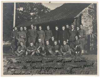 This photograph, taken at a German prison camp in Landshut, Bavaria, depicts a group of Allied prisoners, including Atlantic Monthly correspondent Captain James Norman Hall, whose plane had been shot down in a dogfight over German lines on 7 May 1918. (An arrow drawn in the top border of the photograph points to Hall.) Hall sent the photograph to his friend and editor, Ellery Sedgwick.