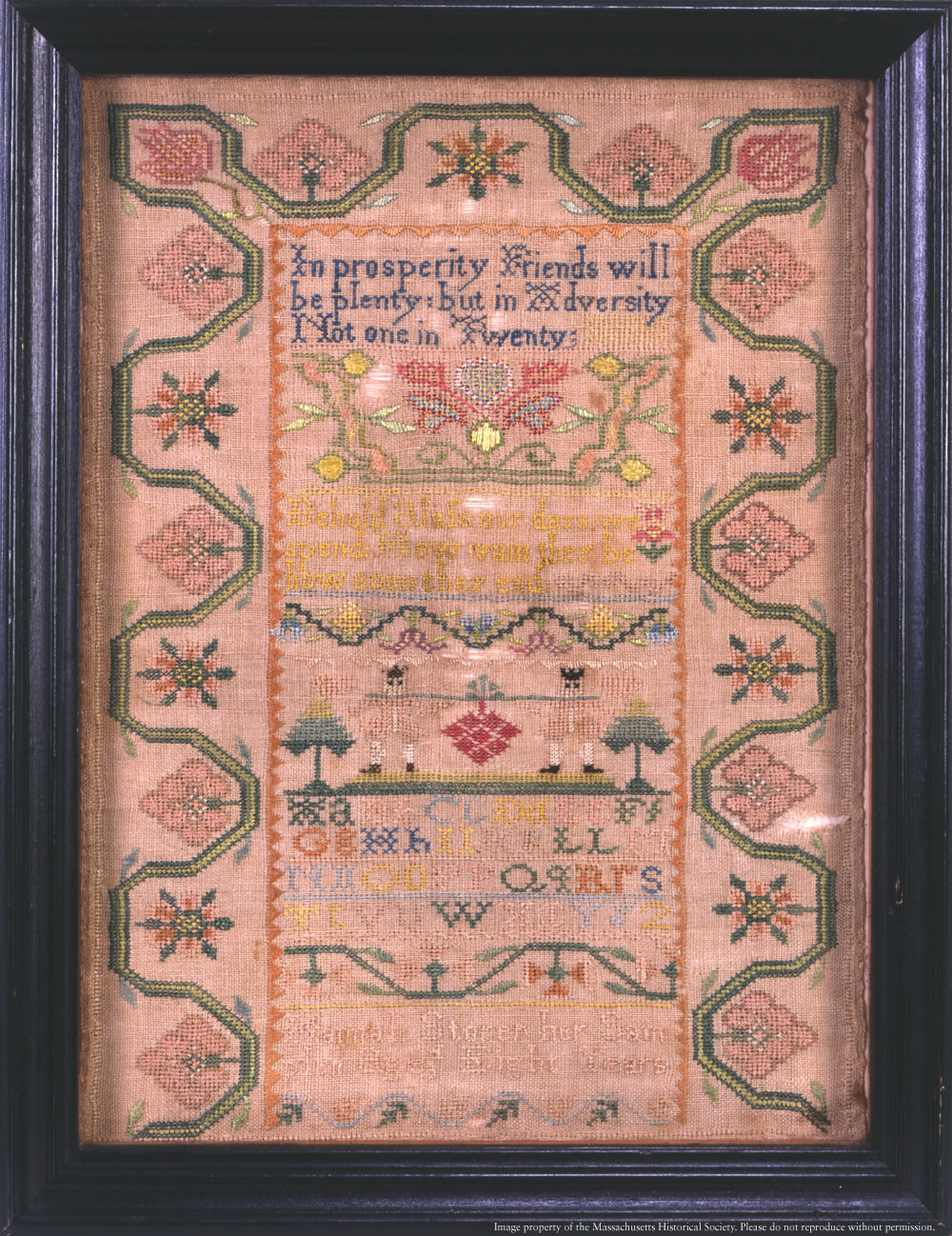 Sampler, 1747. Silk thread on linen. Worked by Hannah Storer (17391811) of Boston, Mass.