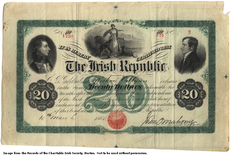 "The Irish Republic." Bond certificate, twenty dollars, serial number 1730 271, issued to Michael Flynn, March 10, 1866. 14 x 25 cm. Charitable Irish Society Records, 1737-1939, Massachusetts Historical Society. click image for more detail (large bandwidth) Click here to view a later bond issued by the Irish revolutionary government. back |