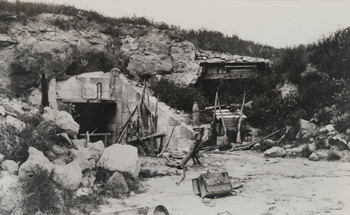 View of machine guns and rifles leaning against the entrance to an abandoned German bunker