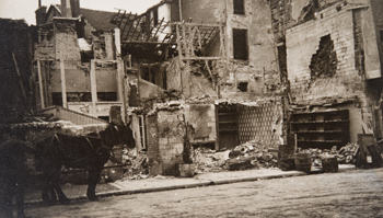 Horse-drawn wagon on the street in front of damaged buildings