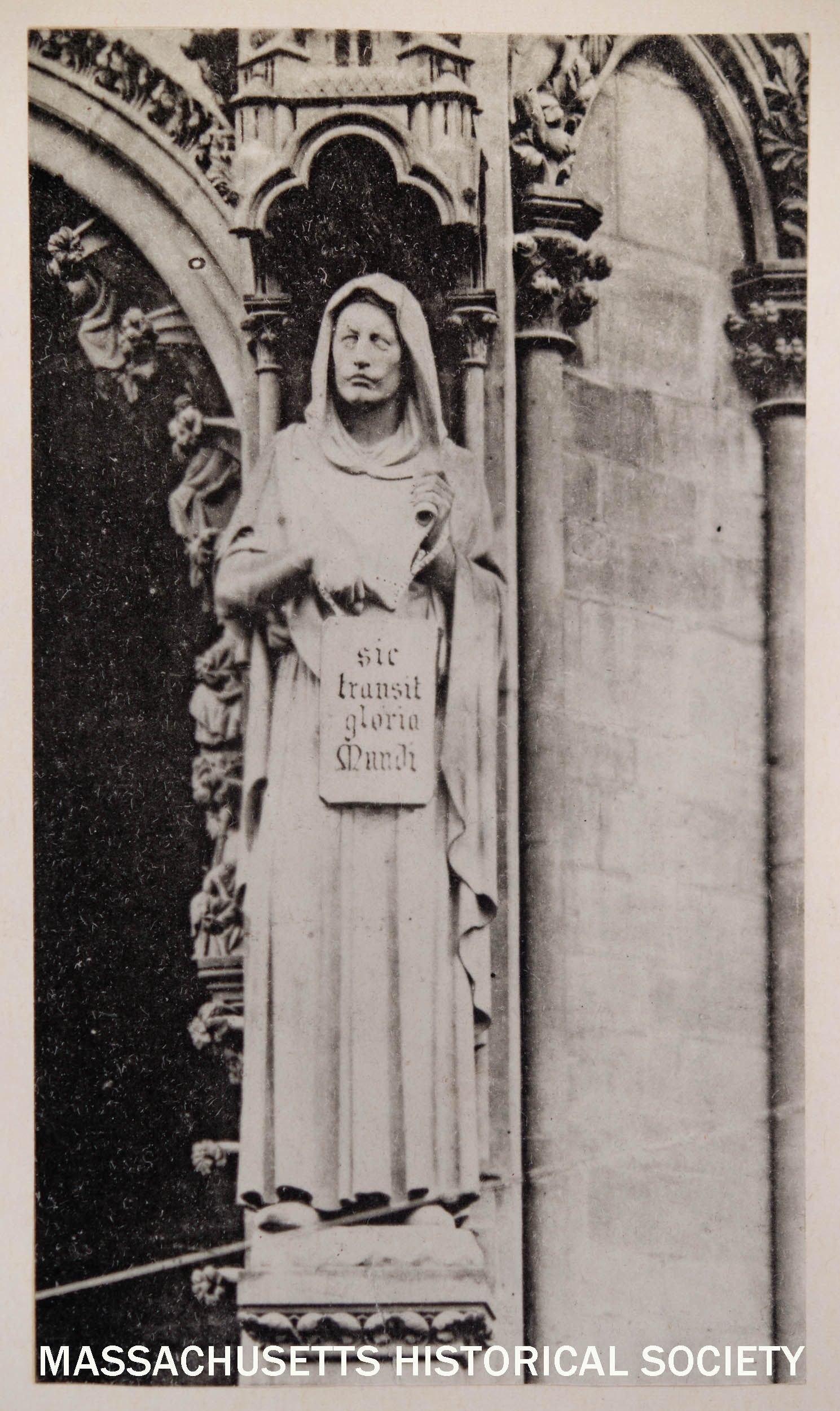 Close-up view of a church exterior, showing a stone statue of a robed figure holding a tablet reading "sic transit gloria mundi", Metz