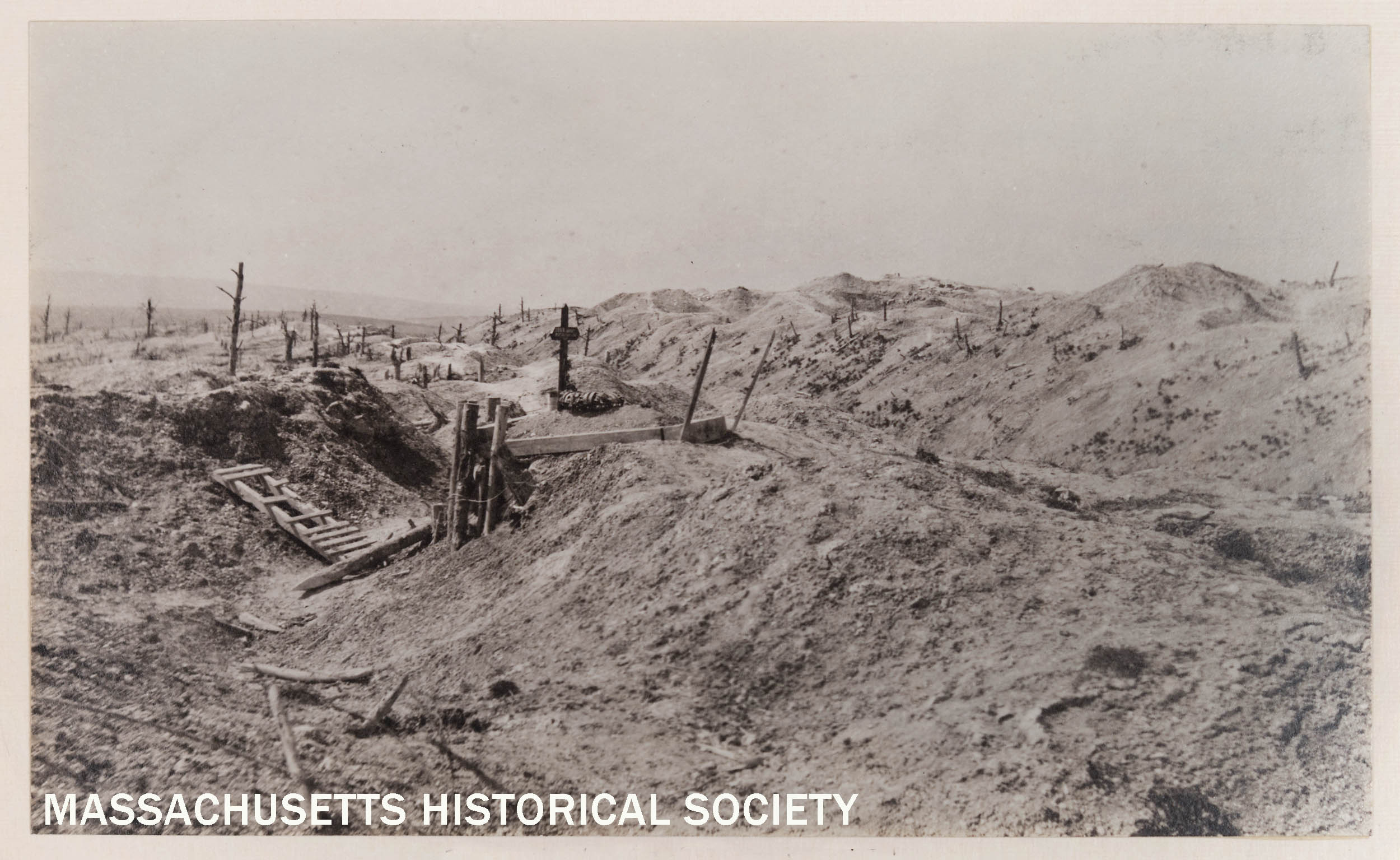 View of a dugout entrance and a cross standing amongst barren hillocks