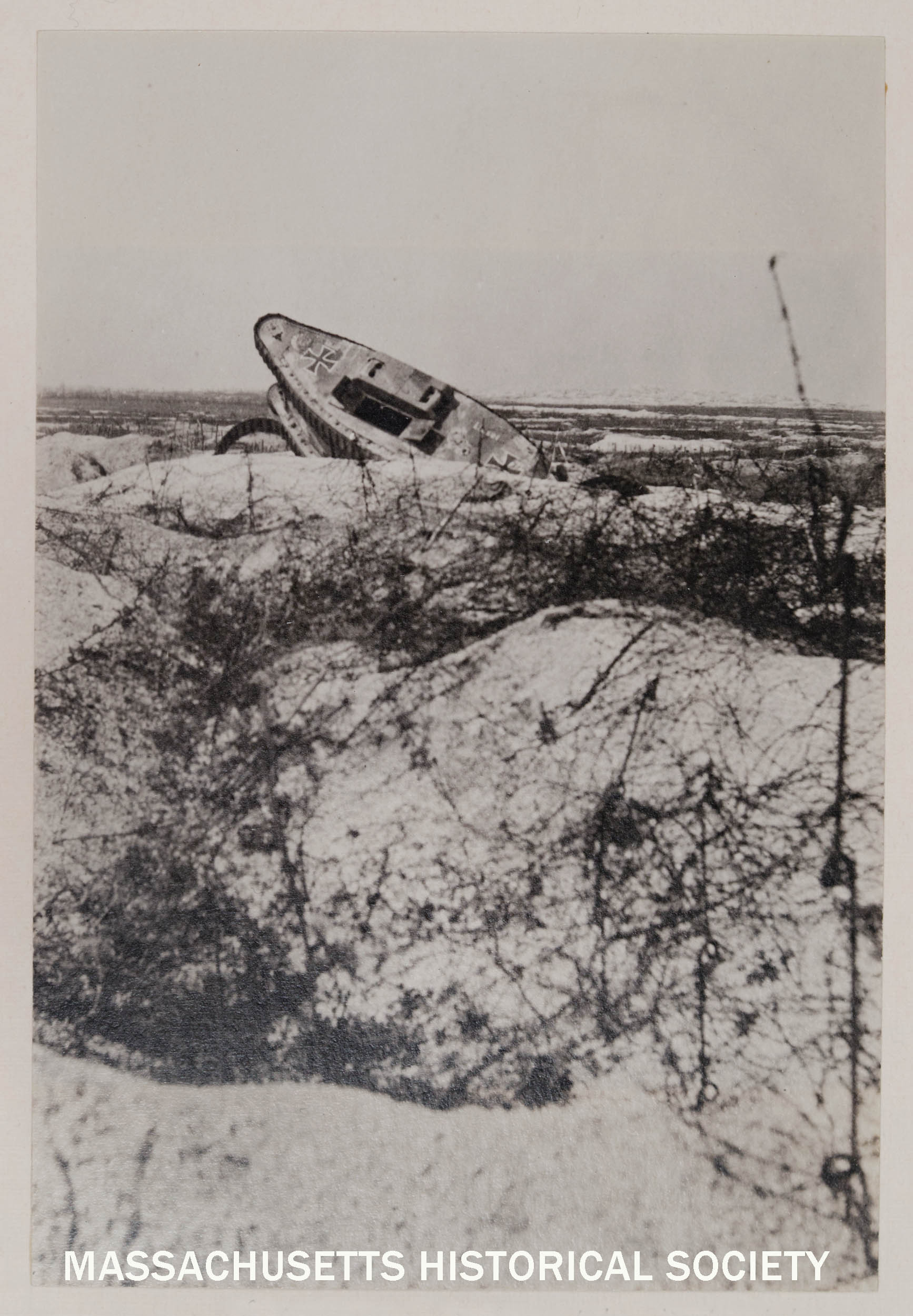 Caption below photograph: "German tank and barbed wire. opp. Pompelle."