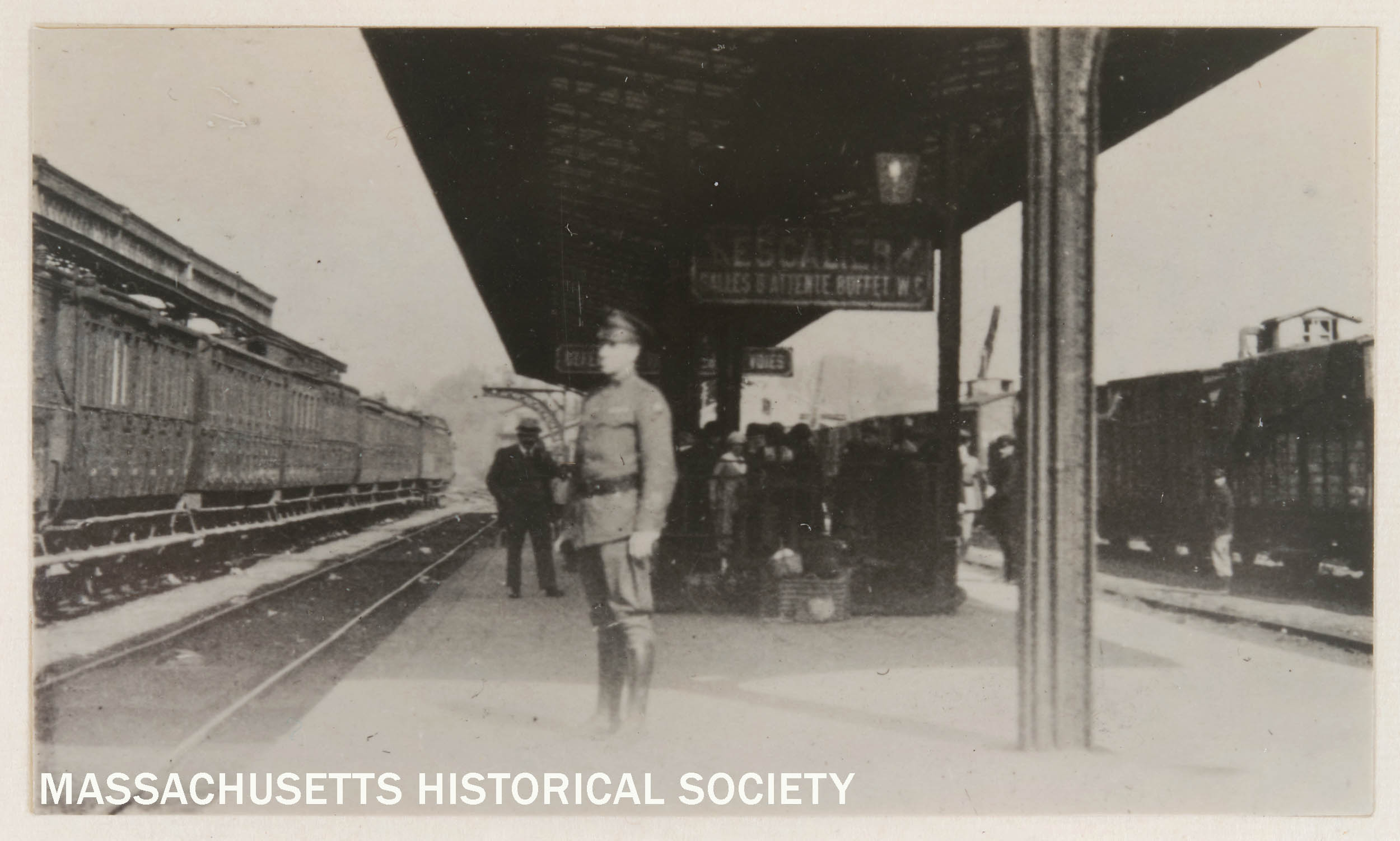 View of a soldier [M. P. Louis Baker] standing on a train platform