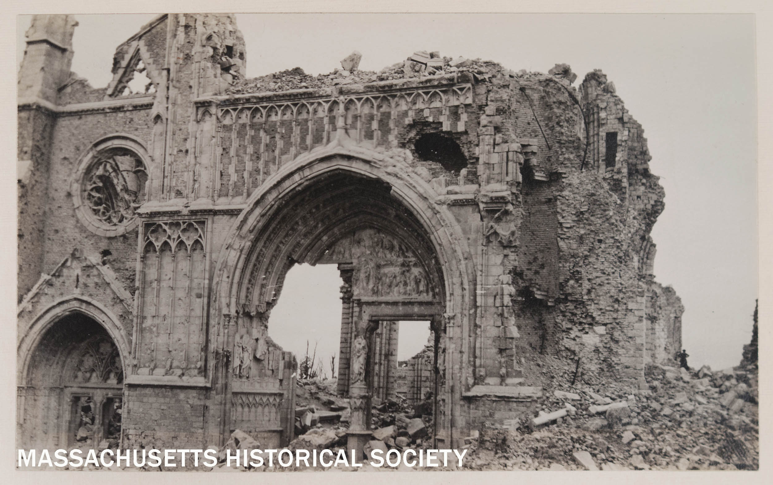 Close-up view of the remnants of a gothic arch from a destroyed stone building, Ypres, 1919