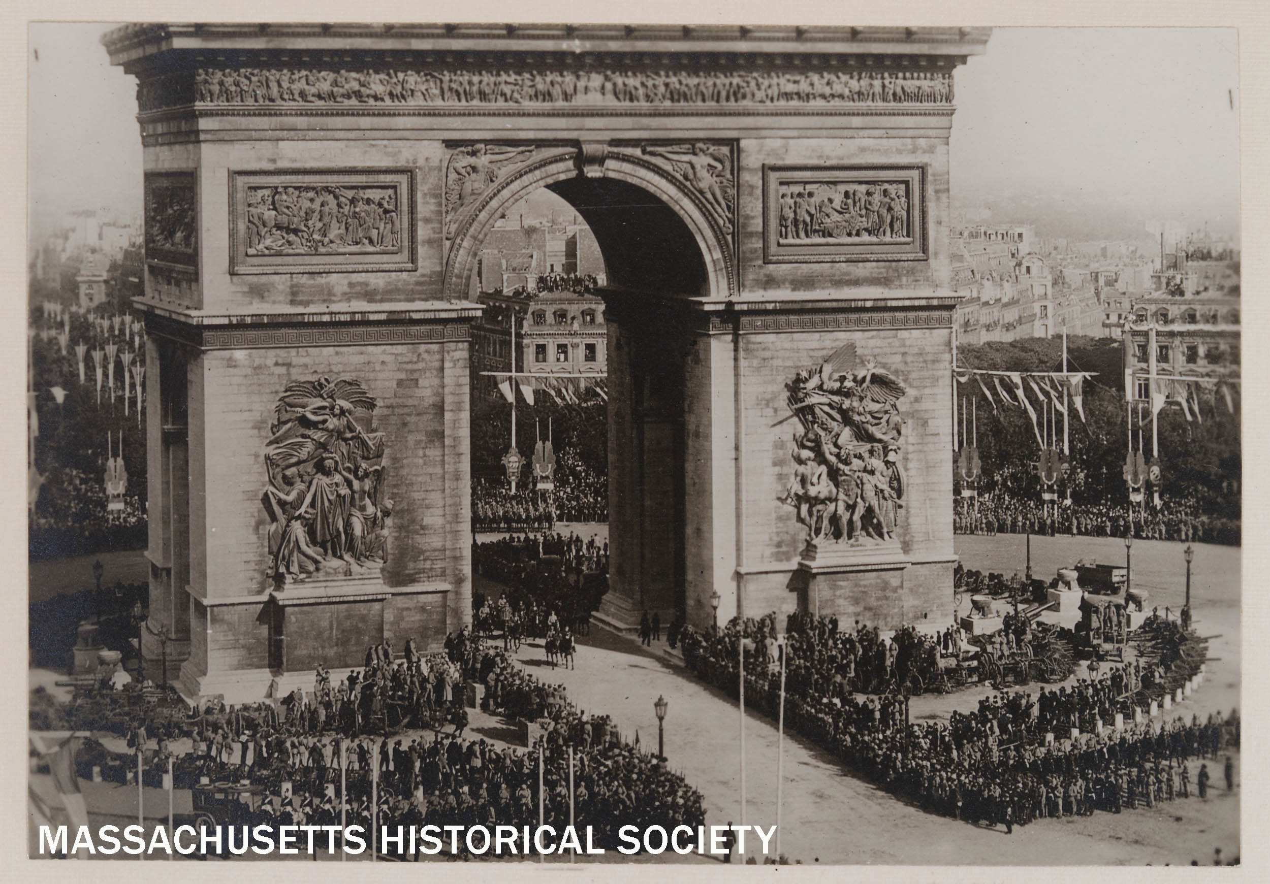 Caption below photograph: "Maréchaux Foch [Marshal Ferdinand Foch] and Joffre [Marshal Joseph Jacques Césaire Joffre]. Le triomphal défilé militaire passent sous l'Arc de Triomphe."