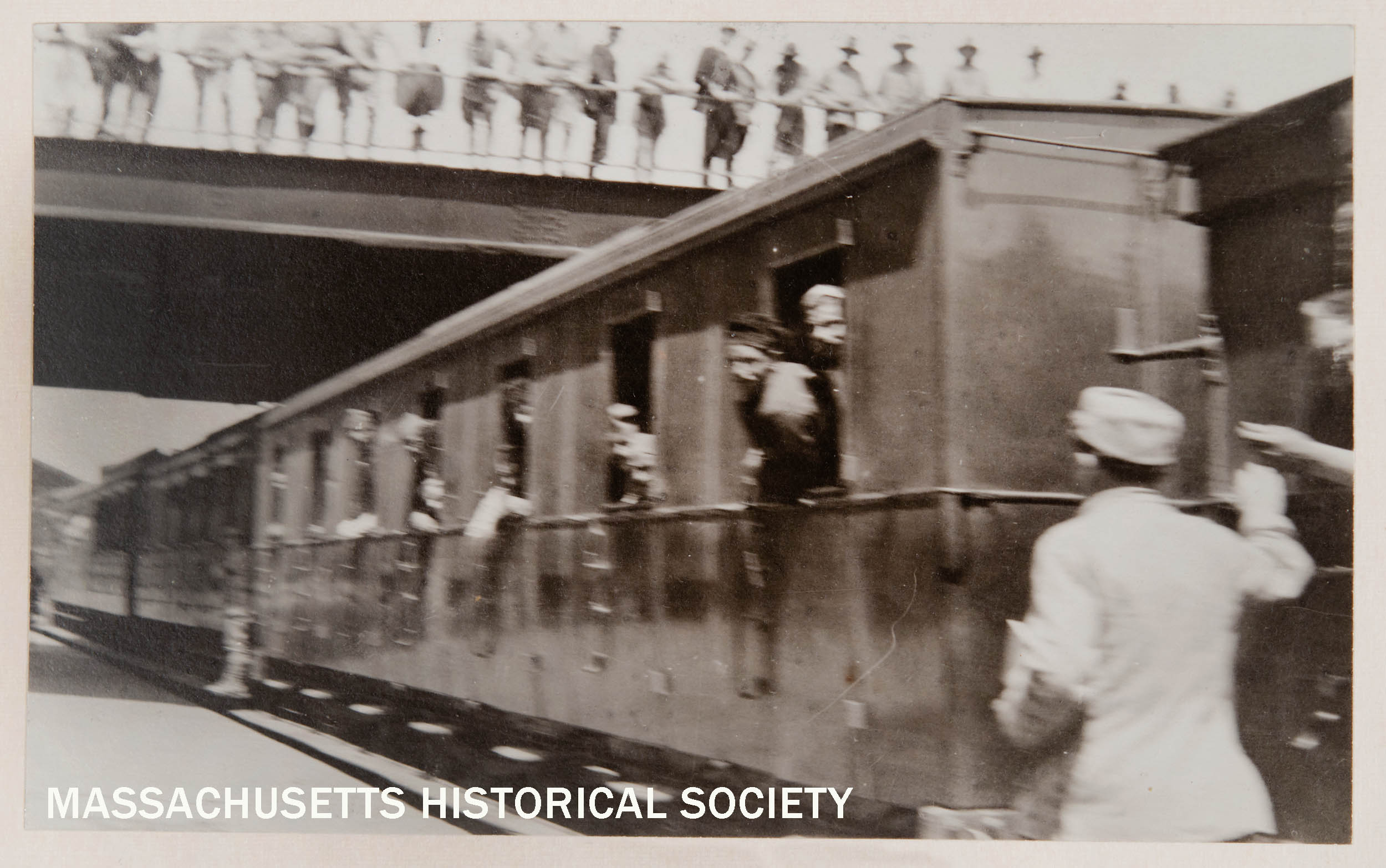 Soldiers leaning out of windows of a train in a station with a bridge overhead