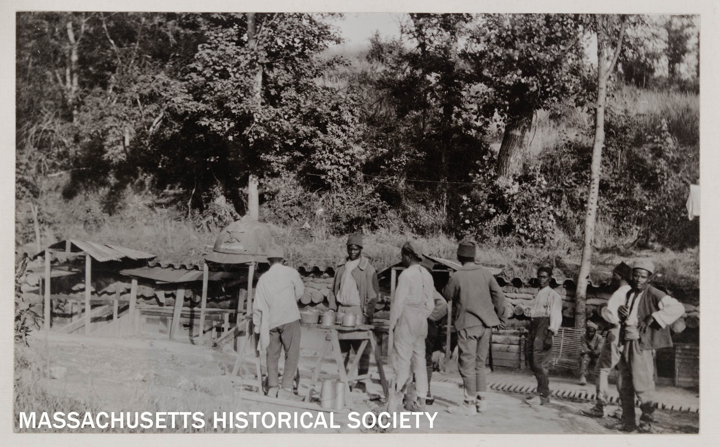 Caption below photograph: "Colonial Camp. Near Soissons. (see: huge steel helmet)"
