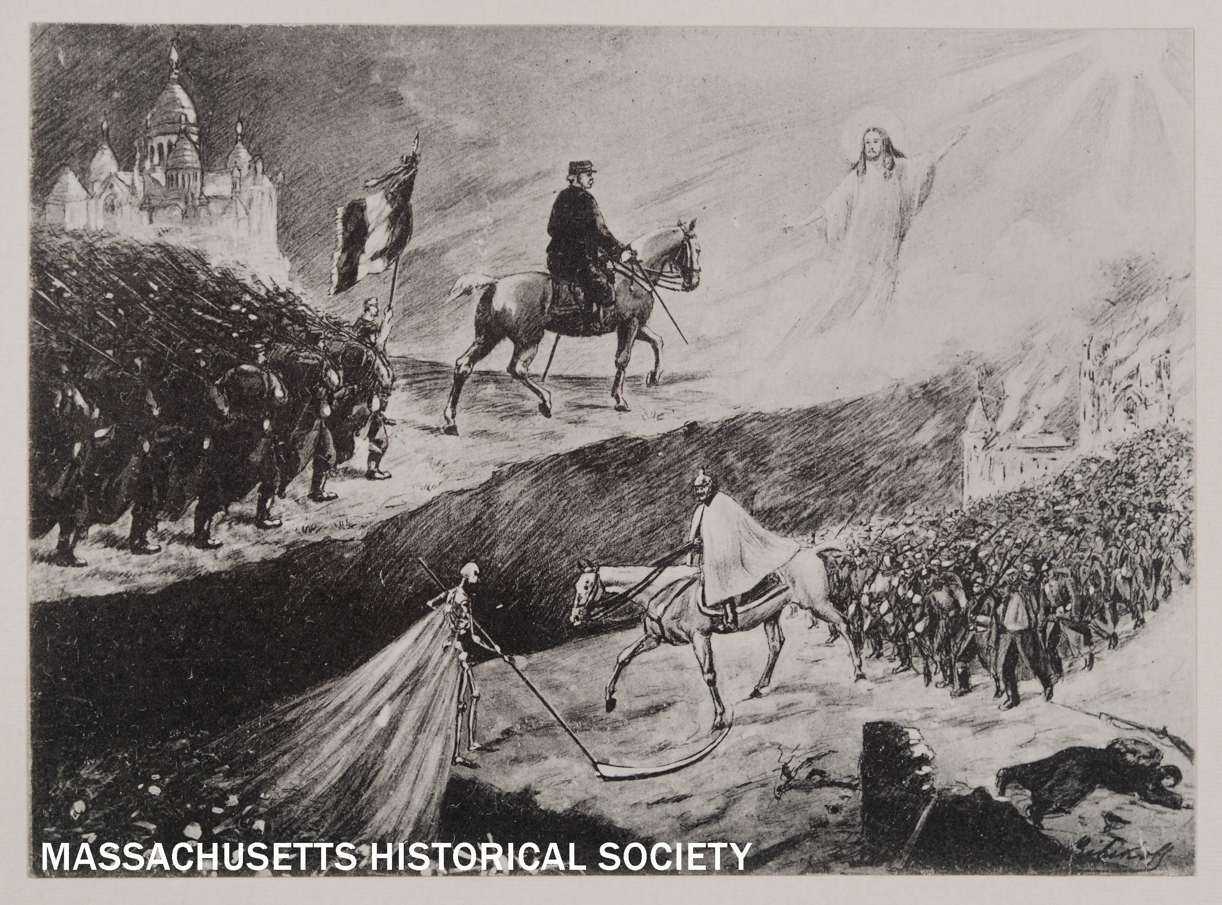 Postcard sketch of a mounted officer leading a column of French troops up towards Jesus in heaven while a mounted German officer leads a column of troops down towards the Angel of Death (Grim Reaper) in hell.