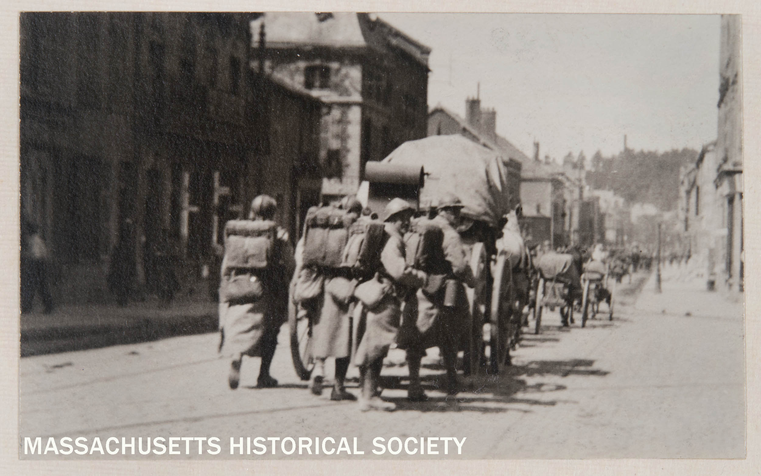 Street-level view of soldiers in full kit and horse-drawn artillery marching through a town
