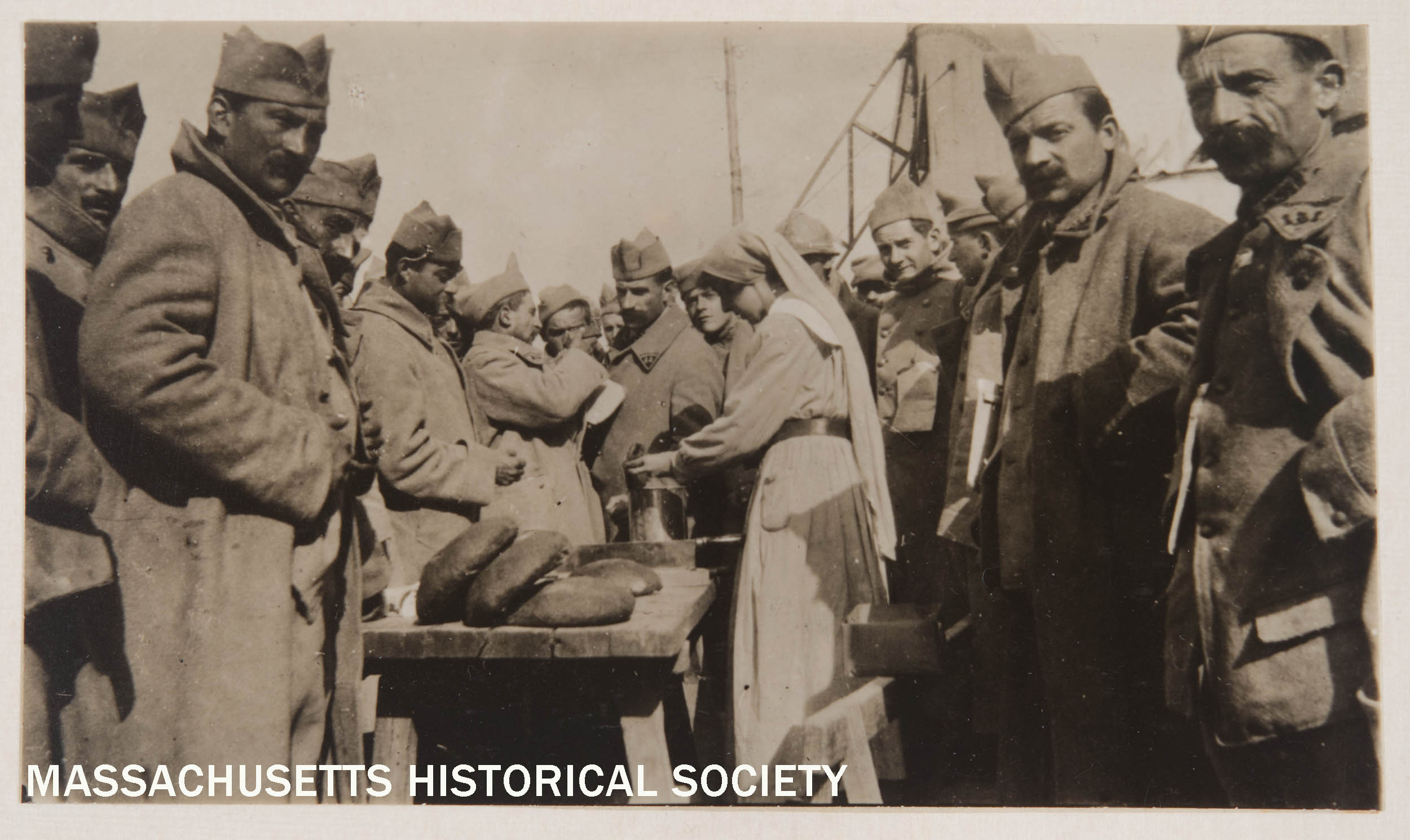 Red Cross worker serving bread and coffee to a crowd of soldiers