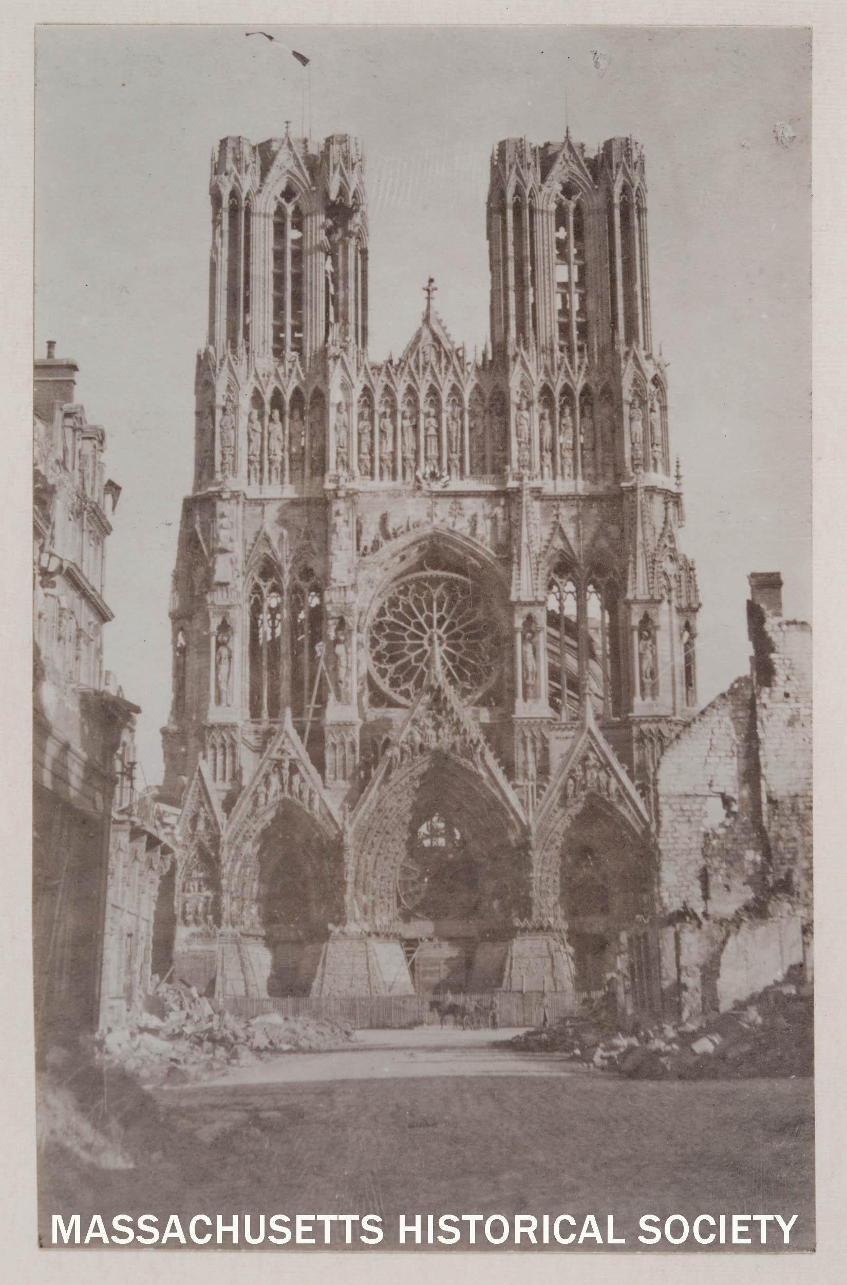 Exterior view of the front of a cathedral showing damage, Reims