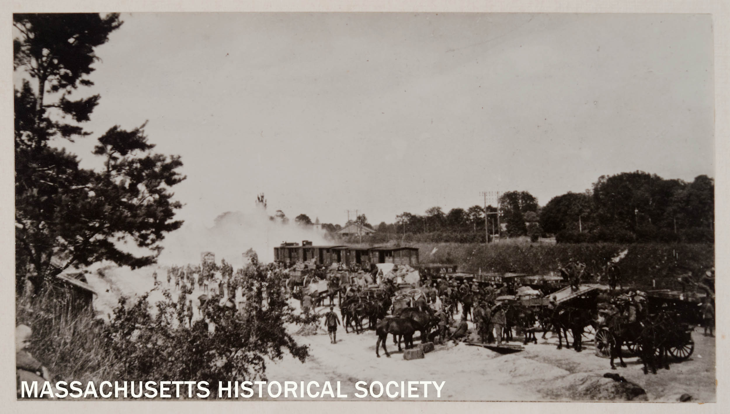Group of soldiers and horse-drawn wagons, 42nd Division at Châlons