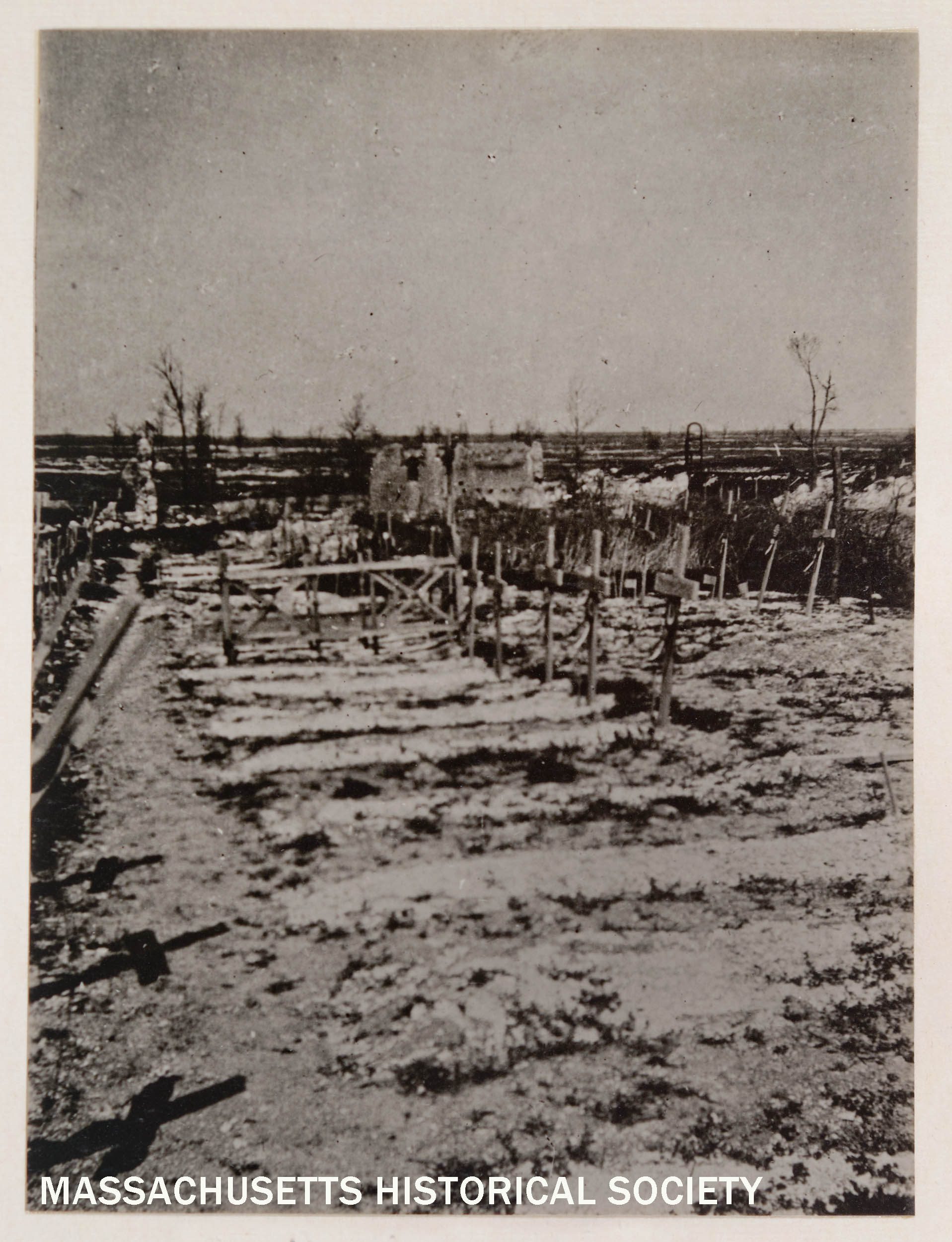 From Letters and Photographs from the Battle Country, typescript narrative by Margaret Hall Photograph facing page 129; Sequence number 171a Caption below photograph: " 'Battlefield Cemetery' "