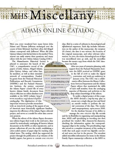 The Society’s weekly e-newsletter provides event listings for the full range of MHS programs, features items from our vast collections, and includes information about news at the MHS. Read past issues below. Please e-mail enews@masshist.org to join the electronic mailing list.