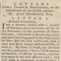 From Philadelphia come a series of twelve letters from "a Farmer in Pennsylvania." They are first printed in The Philadelphia Chronicle and circulated to nearly all the other colonial newspapers and appear in pamphlet form in both America and England. They are among the most widely read publications of the period. The "Farmer" is John Dickinson, a London-educated lawyer who has been a member of Pennsylvania's assembly. As New York is being punished by the Townshend Acts, Dickinson warns that "the cause of one is the cause of all." In a subsequent letter, he examines the constitutionality of the Townshend Acts and declares the new import duties "a dangerous innovation." The colonists are being taxed by Parliament without being represented in Parliament. And they are Englishmen and deserve the rights of Englishmen!