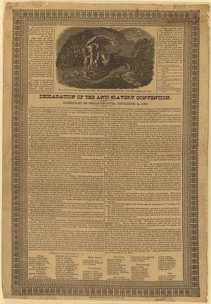 In 1833, sixty abolitionist leaders from ten states meet in Philadelphia to create the American Anti-Slavery Society. They elect officers and adopt a constitution. William Lloyd Garrison drafts the "Declaration of the Anti-Slavery Convention," announcing the Society's intentions. Garrison later uses a phrase from this declaration in a banner displayed at antislavery fairs and festivals.