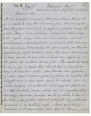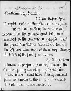 Fifty-three-year-old Hannah Stevenson was the first Massachusetts woman to volunteer to serve as a Civil War nurse. In August 1861 she writes a letter to her family describing her experiences at Columbia College Hospital in Washington D.C. Clara Barton was another Massachusetts Civil War nurse who, after the war, devoted herself to gathering money to help identify missing and dead soldiers. She delivers this lecture in 1866 to raise funds for the cause (she wrote so large in order to see better when giving her speech).