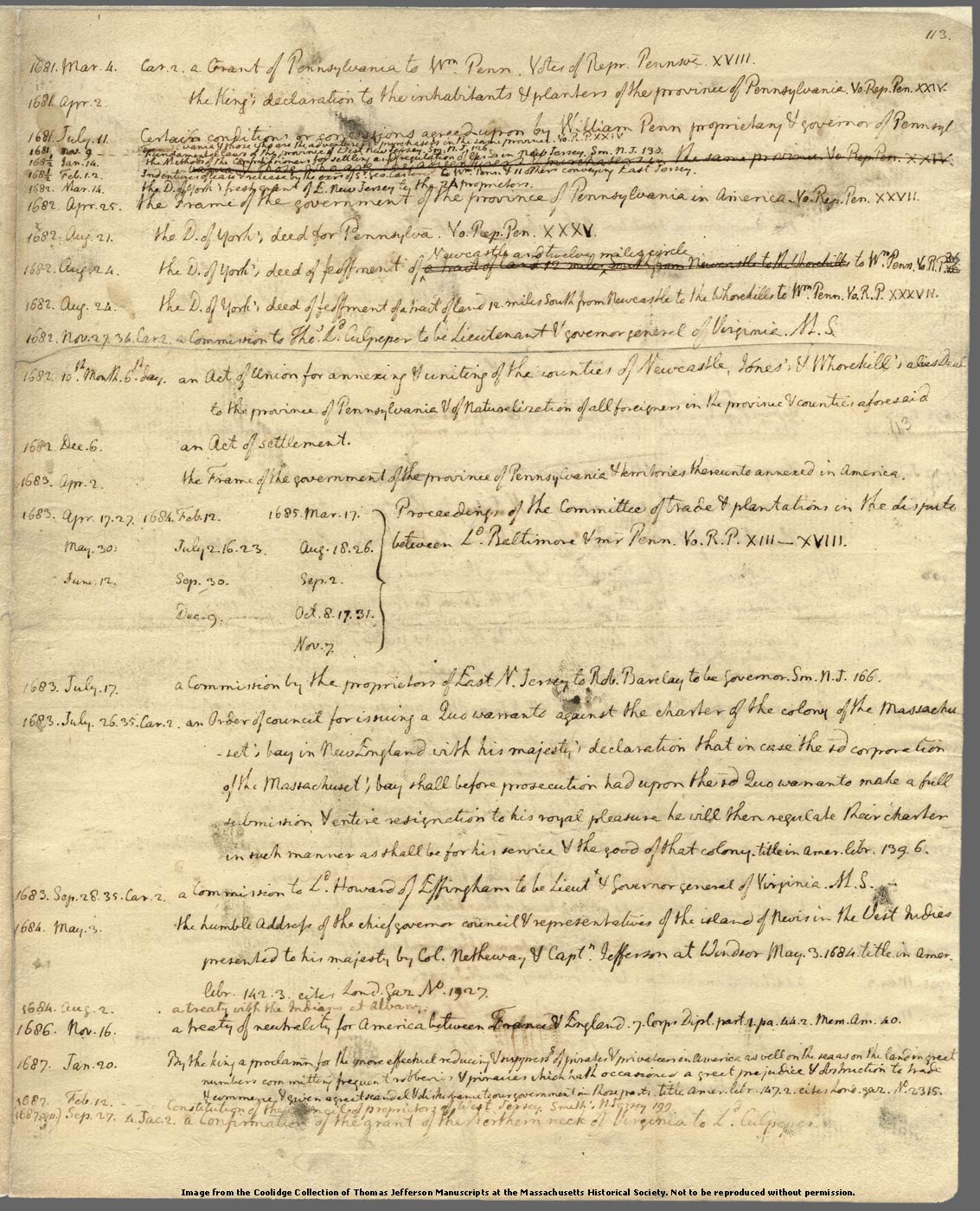 Manuscript page 113, "a Grant of Pennsylvania to Wm. Penn..." (Query 23)