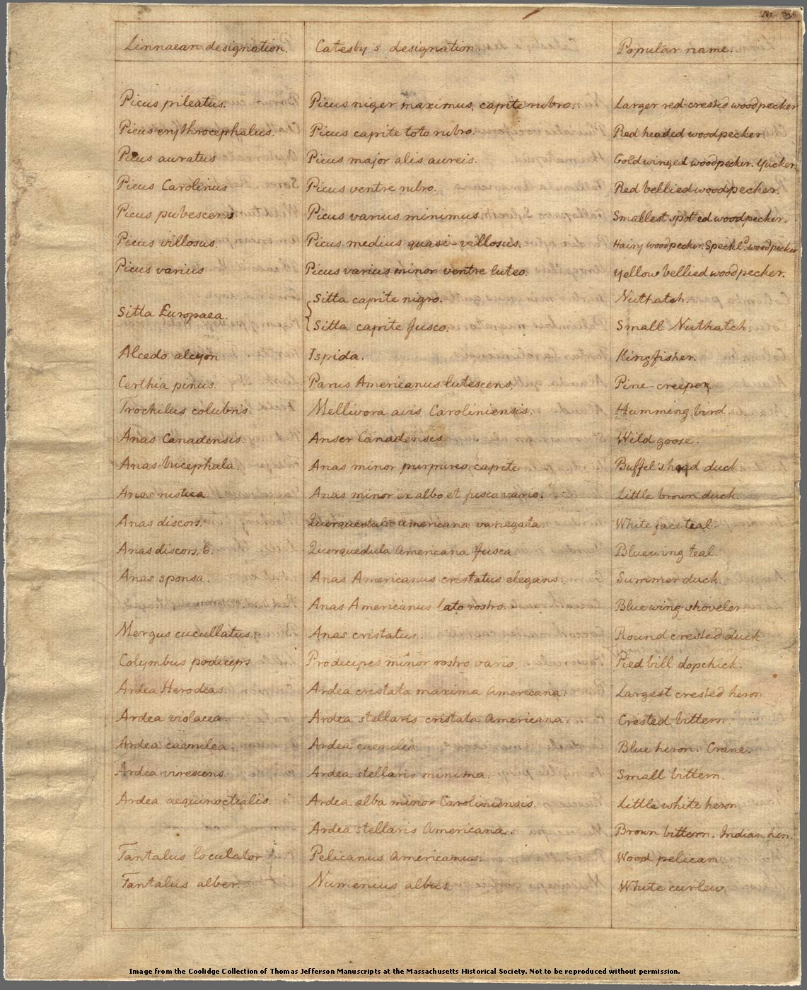Catesby's descriptions of undescribed birds and animals of Virginia, notes assembled by Thomas Jefferson