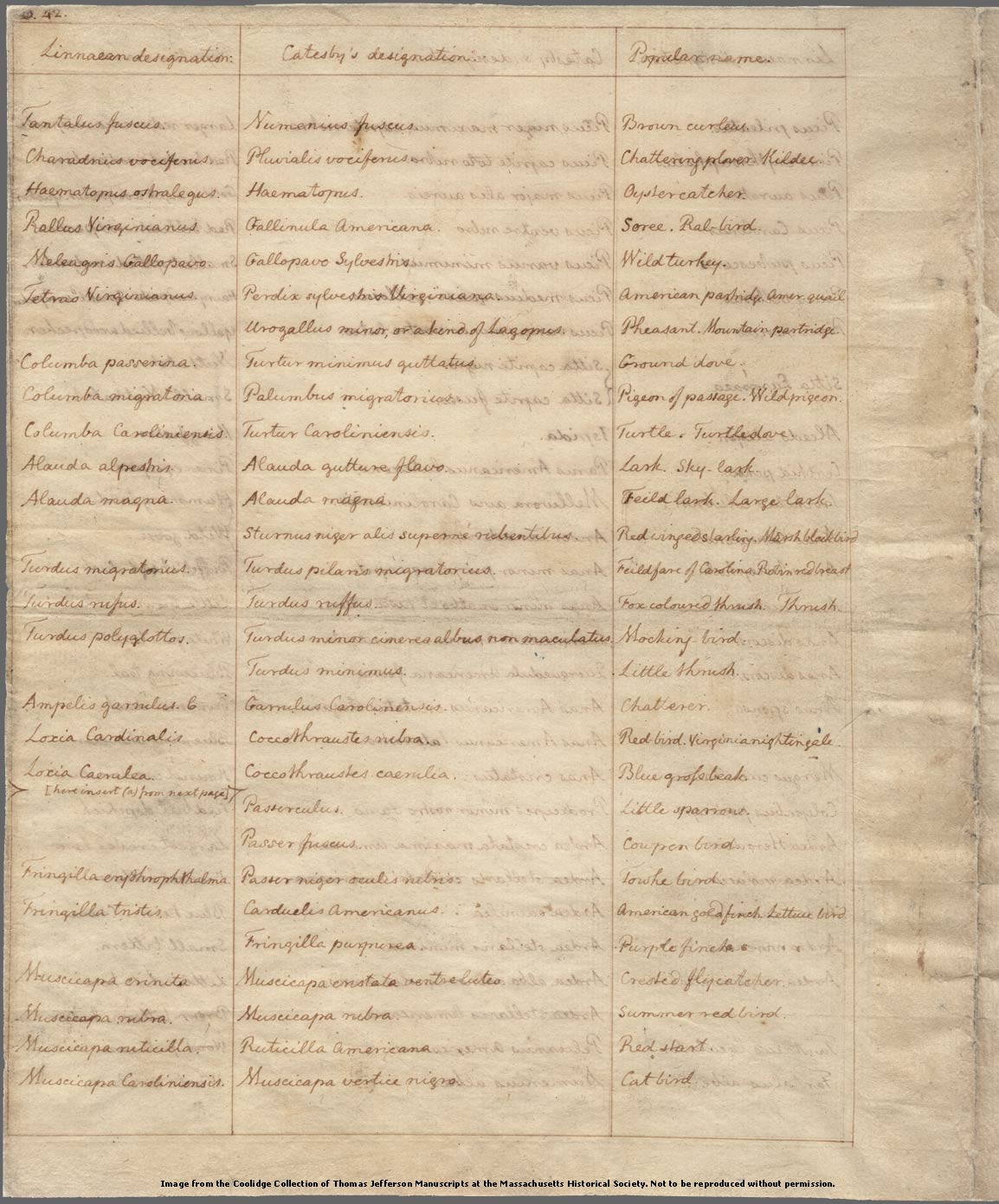 Catesby's descriptions of undescribed birds and animals of Virginia, notes assembled by Thomas Jefferson