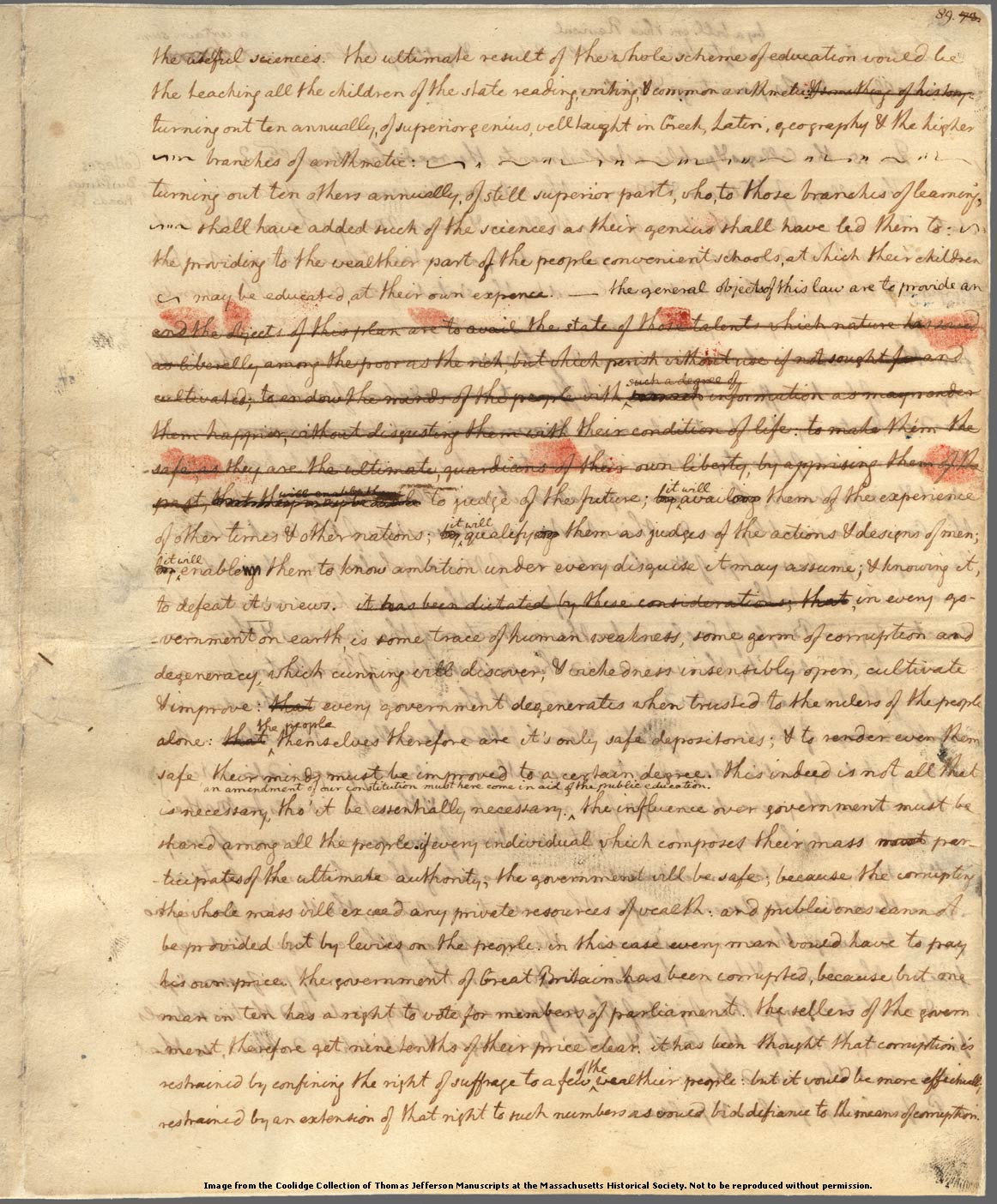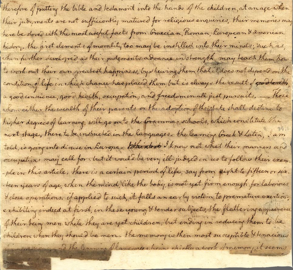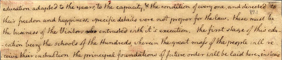 Page 89 had one tab attachment (89.1). Attachment 89.1 has writing on both sides. When reading this page, one must flip up Attachment 89.1 to read the verso before continuing on with the full-page. A portion of Attachment 89.1 was damaged prior to its acquisition by the Massachusetts Historical Society. The missing text is available in printed versions of Notes on the State of Virginia.