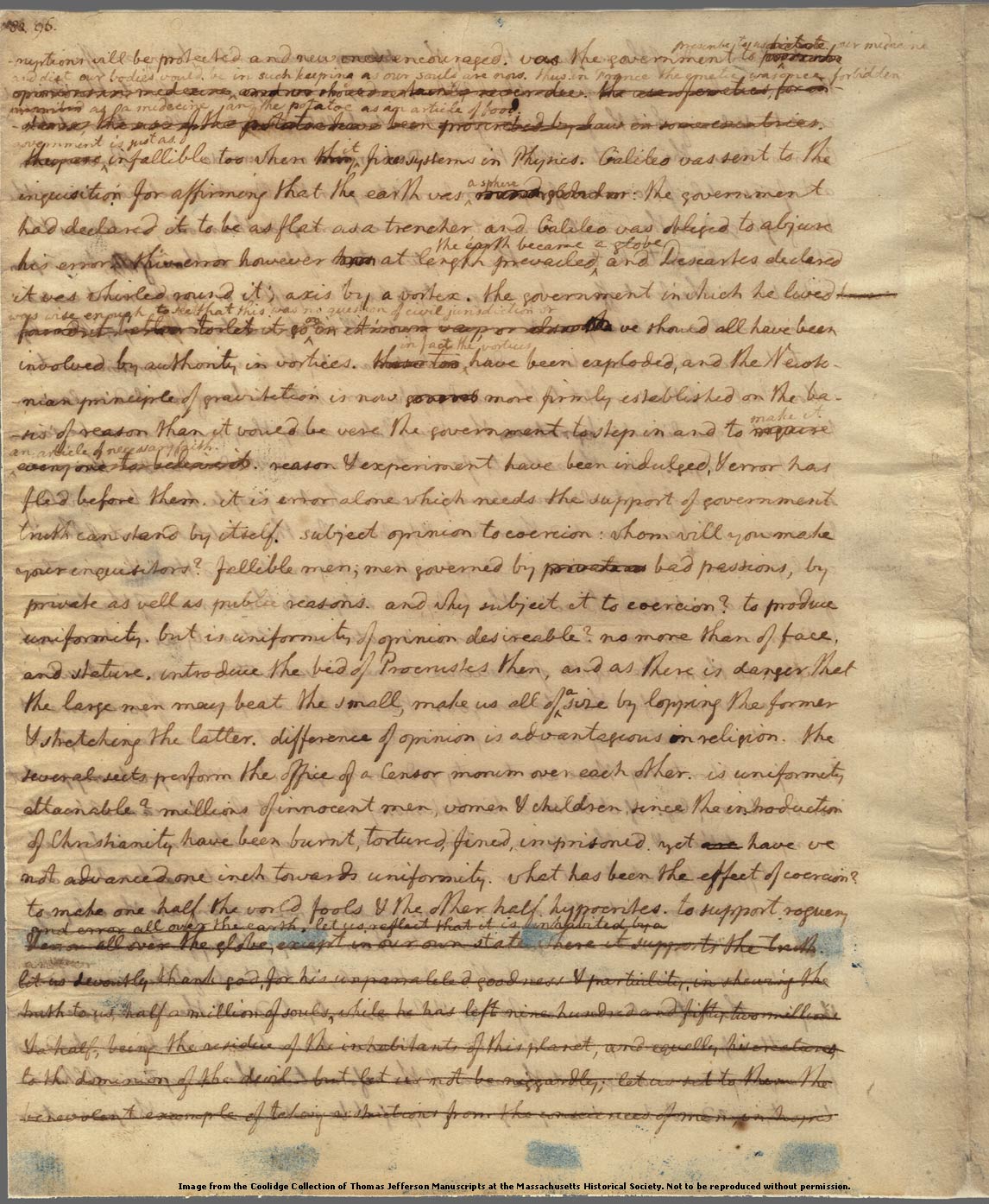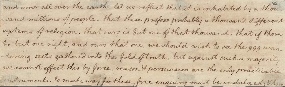Page 96 had one paste-down attachment (96.1). Attachment 96.1 only has text on one side and is a revised version of the text which it concealed. To see Jefferson's original thoughts, click the "remove" button in the Key.